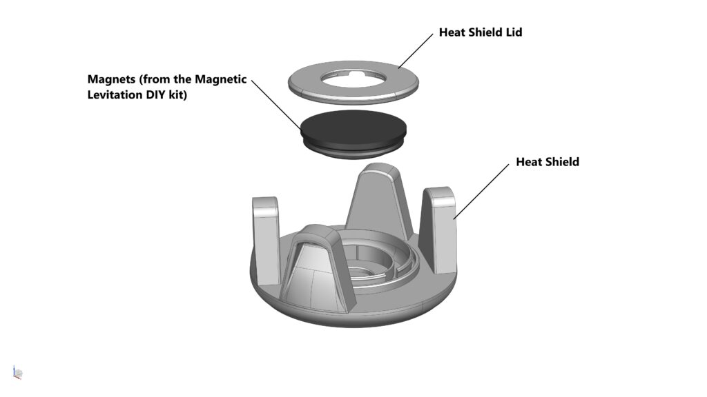 - STEP 2a: Carefully disassemble the “Float” of the Magnetic Levitation DIY Kit and transfer all the internal parts (e.g. magnets, power supply coil, and the light board) from the original 3D printed shell into the Heat Shield of the DRACO model
