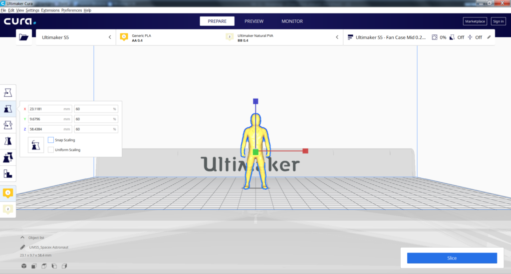 SpaceX Astronaut: You need to scale the astronaut model down to 60% to get the correct scale (in relation to the rest of the model). Also, print with raft to create a small base for the model to stand on its own