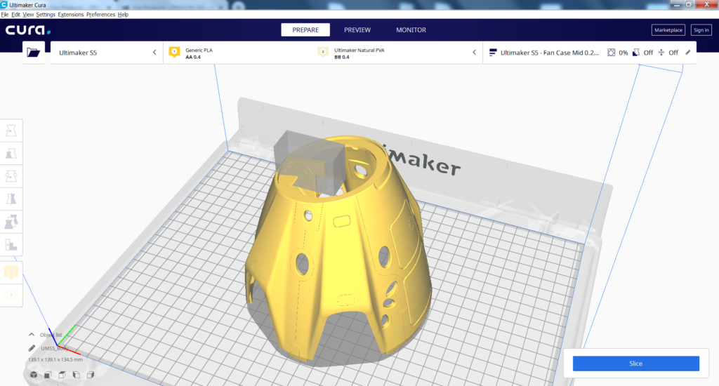 Trunk: The entire Trunk can be printed without any support except the areas underneath the fins. Therefore, you can create a ‘huge’ Support Blocker as shown in the picture to avoid any support from being generated on the model BUT leave the fins out because we need support underneath them
